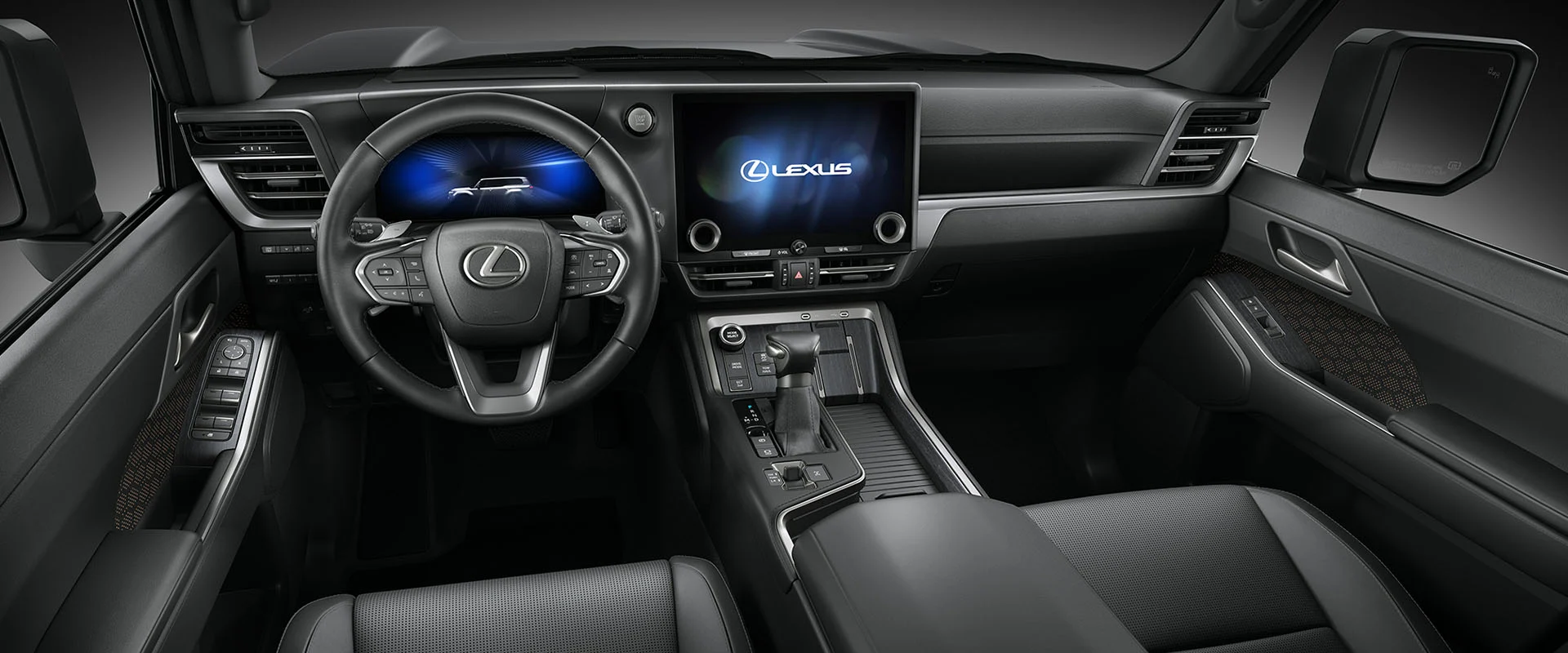 Khoang nội thất Lexus GX 550 Luxury cũng sử dụng các đường nét thiết kế vuông vức và chắc chắn, đậm chất Off-road, nhưng kết hợp với các chất liệu cao cấp và sang trọng.